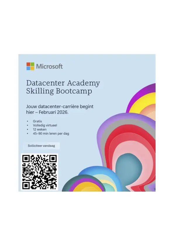 Dit volledig virtuele, interactieve programma van 12 weken—live gegeven door Microsoft-medewerkers—rust je uit met de vaardigheden die nodig zijn om functies na te streven zoals Datacenter Technician, Datacenter Inventory & Asset Technician en Critical Environment Technician. Of je nu van carrière wilt veranderen, terugkeert naar de arbeidsmarkt of een nieuwe richting verkent, de Bootcamp opent de deur naar kansen in datacenters, zonder dat eerdere technische ervaring vereist is.